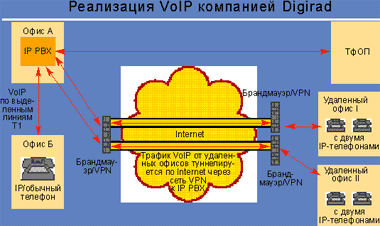 | Решение Digirad. В системе VoIP компании Digirad речевой трафик передается как по частным, так и по общедоступным сетям. Для связи с главными офисами Digirad использует каналы T1. Два удаленных офиса связаны с телефонной системой IP PBX туннелями IPSec VPN. Эта же система соединена с общедоступной телефонной системой для звонков за пределы сети VoIP. |