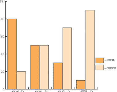 | Рисунок 3. Соотношение использования технологии SHDSL и HDSL (по прогнозам Alcatel). |
