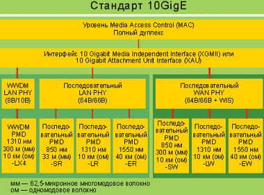 Как показано на рисунке, в трех подуровнях PMD применяется новая и более эффективная схема кодирования 64B/66B (10GBasexR); каждый из них передает последовательный сигнал со скоростью до 10 Гбит/с на расстояние в 300 м по одномодовому волокну при длине волны 850 нм (10GBaseSR), 1310 нм (10GBaseLR) и 1550 нм (10GBaseER). Последние три сочетают кодирование 64B/66B с WIS (10GBaseXW) и могут передавать последовательный сигнал 10 Гбит/с при длине волны 850 нм (10GBaseSW), 1310 нм (10GBaseLW) и 1550 нм (10GBaseEW).