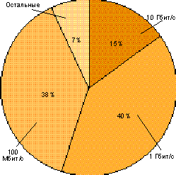 Соотношение сетей Ethernet с различной скоростью передачи данных к 2005 г. (по данным компании Dell?Oro).