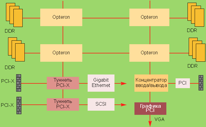 Рисунок 5. Четырехпроцессорная система с процессорами Opteron и шинами HyperTransport.
