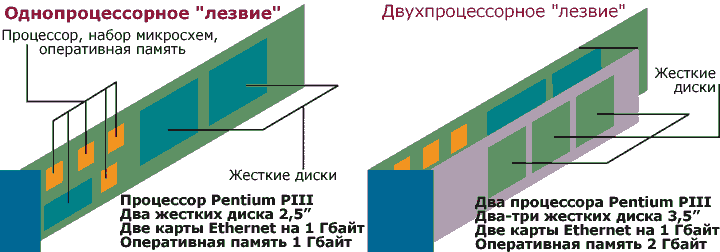 Рисунок 1. Два монтажных варианта для «лезвий»: простое «лезвие» представляет собой сервер на одной плате, между тем как расширенная версия на двух платах обладает большей производительностью.