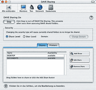 Другой альтернативой является использование программы Dave 3.1 от компании Thursby в версиях для ОС Х и для МacOS 9.х. В отличие от Sharity, эта программа не пользуется возможностями блока серверных сообщений ОС Х, а имеет свой инструментарий. Она дополняет диалоговое окно «Соединение с сервером» собственной программой просмотра, с помощью которой пользователь может легко найти разрешения Windows и зарегистрироваться. Администратор при помощи Dave способен задать разрешения под ОС X, потом соответствующие разделы можно будет найти с каждого компьютера Windows, если сетевая программа просмотра функционирует под управлением Windows. Иначе говоря, Dave 3.1 не является дорогой с односторонним движением, как Sharity, а предлагает доступ к соответствующим ресурсам и с компьютера Windows. Вдобавок программа обеспечивает доступ к работающим под ОС X принтерам с компьютера под управлением Windows. Продукт можно приобрести приблизительно за 200 евро.