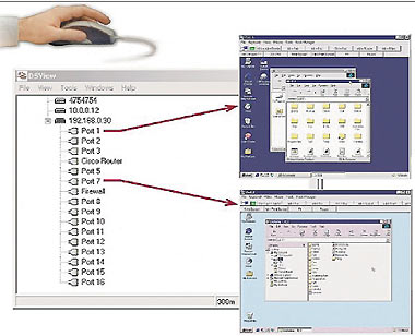 Более осязаемые действия предстоит проделать при инсталляции аппаратных вариантов. Порты клавиатуры, монитора и мыши целевого сервера соединены с переключателями при помощи специального кабеля или по Категории 5. Большинство производителей уже сейчас предоставляют прямой доступ к серверу через локальный порт для администрирования. Сама функция удаленного управления реализуется путем преобразования аналогового управляющего сигнала и пересылки его по сети IP в реальном времени. На удаленной стороне необходимо установить небольшое приложение, как и в случае программного решения. Именно это приложение предоставляет доступ к целевому серверу. Продукты с расширенной функциональностью позволяют к тому же настраивать административные серверы, с чьей помощью можно определять права доступа, производить настройку пользовательских параметров и задавать протоколы. После установки нужных компонентов все подключенные серверы (а при необходимости и последовательные устройства) появляются в древовидной структуре на дисплее пользователя. Один щелчок мышью — и экран соответствующего содержания открывается в отдельном окне.
