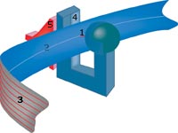 Рисунок 1. Процесс записи/считывания информации на лентах POS. 1 - Лазеры/оптика; 2 - Оптические направляющие дорожки; 3 - Магнитные дорожки с данными; 4 - Улучшенная магнитно-резистивная дорожка; 5 - Вращающийся оптический сервопривод |