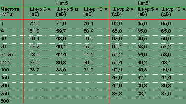 Переходное затухание на дальнем конце зависит от длины кабеля, так как при прохождении через кабель сигнал затухает. Это означает, что перекрестные наводки на принимающей стороне в длинных кабелях меньше, чем в коротких. В таблице приведены граничные значения для кабелей Категорий 5 (действующий европейский стандарт) и 6 (действующий американский стандарт).