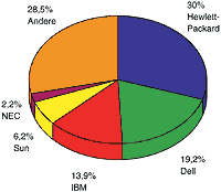 Согласно результатам исследования, несмотря на незначительные потери, лидирующее положение занимает Hewlett-Packard (HP), ей принадлежит 30% рынка. То, что потеряла HP, досталось главным образом Dell. Компания занимает второе место с 19,2%, поднявшись на 2,4 пункта. IBM с 13,9% и с тем же числом проданных серверов — на третьем месте. На четвертом — Sun, она продала приблизительно на 10 000 серверов больше, чем в том же квартале 2001 г. (см. Таблицу).