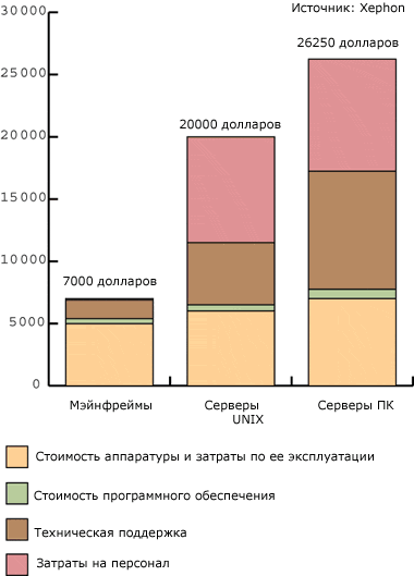 Приведенные цифры не универсальны. Их надо воспринимать как ориентир для сравнения различных систем, указывающий, что выбор в пользу мэйнфреймов представляется наиболее целесообразным решением, за исключением маломощных систем, предназначенных для обслуживания 50 и менее пользователей.