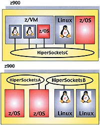 Технология HiperSockets позволяет формировать сеть TCP/IP внутри мэйнфрейма z800/z900 без применения дополнительных физических кабелей, благодаря чему задания, выполняемые в различных операционных средах, могут «общаться» между собой через логические разделы LPAR по высокоскоростным соединениям (практически со скоростью обмена с оперативной памятью, см. Рисунок 1).