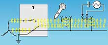 С помощью датчика-катушки можно образовать замкнутую цепь для формирования токового сигнала путем замыкания пары проводников. Однако рекомендовать такой способ для обслуживания существующих сетей нельзя, в случае невнимательности это может привести к серьезным последствиям (достаточно забыть перемычку на дальнем конце по окончании работ). Гораздо проще работать с высокочастотным генератором, к тому же он обеспечит необходимый для трассировки ток за счет емкостной связи пары проводов линии.