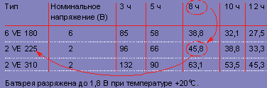 - Выбираются две группы по 24 элемента, на каждый из которых приходится 2200 : 48 = 45,8 Вт. Пользуясь таблицами разрядных характеристик батарей (см. Таблицу 1), выбираем две группы аккумуляторных батарей по 24 элемента Hawker PowerSafe 2VE225 емкостью 200 Аoч каждая (суммарная емкость 400 Аoч).