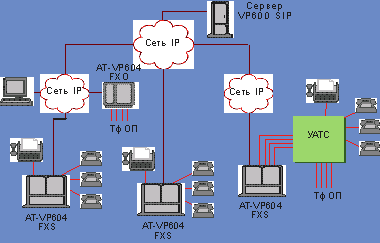| Рисунок 3. Организация IP-телефонии в корпоративной сети с помощью шлюзов Allied Telesyn серии VP600 предусматривает сохранение обычных телефонов и УАТС для выполнения базовых функций коммутации. Устройства AT-VP604 с интерфейсами FXO (для подключения линий ТфОП) или FXS (для аналоговых телефонов), с одной стороны, и портом Ethernet 10/100, с другой, играют роль шлюзов, преобразующих голос в пакеты IP и обратно |