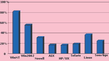 Начиная с Windows 2000, Microsoft внедряет единые пользовательские интерфейсы во все компьютеры, оснащенные операционными системами от Microsoft. В настоящее время примерно 80% предприятий используют серверы Windows NT и 55% — серверы Windows 2000 (см. Рисунок 1). Кроме того, около 40% пользователей работают с серверами Linux, и почти 20% имеют машины под управлением HP-UX, AIX или Solaris. Как показывают результаты «Второго независимого исследования рынка администрирования клиентов» («2. Unabha..ngige Marktstudie Client-Management», Deron Systemhaus, 2002), в последние годы доля серверов Windows 2000 и Linux существенно выросла.