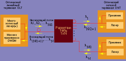 Рисунок 4. В системах PON с волновым мультиплексированием (WDM) каждому абоненту выделяется своя длина волны.