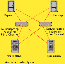 | Рисунок 2. Кластер с избыточными компонентами Fibre Channel и системами хранения. |