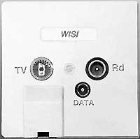 При данной системе распределения по стоякам проходят коаксиальные и симметричные кабели. Разводка телевидения выполняется коаксиалом, а Internet и телефона — витыми парами. В квартиру входят кабели обоих типов. Абонентские розетки могут быть как отдельные — для ТВ и Internet, так и совмещенные, т. е. в одном корпусе могут находиться гнезда типа F или МЭК для телевидения и восьмиконтактные порты RJ-45 для Internet. Заметим, что подобные розетки уже появились. Внешний вид одной из таких розеток показан на Рисунке 3, где в левой нижней части можно видеть гнездо RJ-45.