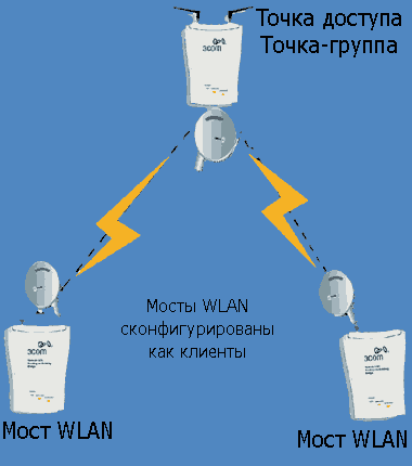 | Рисунок 2. Конфигурация «точка-группа» с мостами беспроводных локальных сетей в качестве клиентов. |
