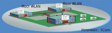| Рисунок 1. Пример использования беспроводного моста между локальными сетями. |