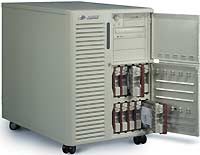 Особое внимание уделено надежности и удобству коммуникации: стандартный комплект поставки включает два высокоскоростных последовательных порта 16550А, параллельный порт ECP/EPP, разъемы USB, сетевой адаптер на базе контроллера i82550. Устройства снабжены тремя объединенными блоками питания общей мощностью 700 Вт с автоматической вариацией частоты (50/60 Гц) и входного напряжения (110/220 В). Серверное шасси выполнено в виде корпуса-башни. Все ключевые процессы отражены на передней панели корпуса в виде диагностических индикаторов и кнопок управления.