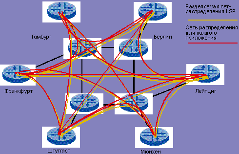 В случае MPLS с коммутацией ячеек для каждого приложения (VPN и т. д.) должна строиться собственная распределительная сеть. Поэтому иерархия стека меток имеет плоский характер.