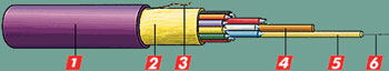 Рисунок 2. Конструкция кабеля. 1 — Оболочка (из материала с противопожарными свойствами) 2 — Силовой элемент 3 — Разрывная нить 4 — Опорный элемент 5 — Трубчатый модуль 6 — Волоконный световод Источник: WIR Electronic |