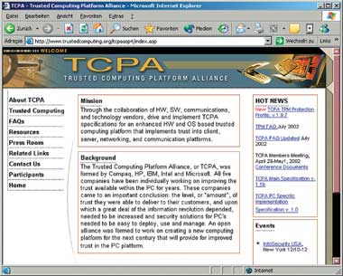 TCPA Консорциум Trusted Computing Platform Architecture основан в октябре 1999 г. компаниями Compaq, HP, IBM, Intel и Microsoft с целью разработки «заслуживающей доверия платформы аппаратного обеспечения». В настоящее время он насчитывает около 180 членов, однако точный список сохраняется в тайне. Спецификация 1.0 была принята 9 сентября 2001 г., новейшая спецификация доступна только под NDA.