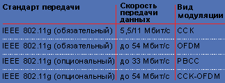 | Таблица 2. Скорость передачи данных в стандарте 802.11g. |