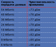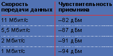 | Таблица 3. Чувствительность приемника распространенных систем стандарта 802.11b при различных скоростях передачи данных. |
