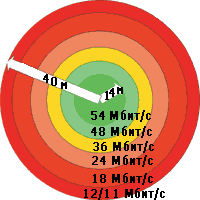 - системы стандарта 802.11g очень хорошо масштабируются вниз до этой границы, так что в «переходном диапазоне» от 54 до 11/12 Мбит/с скорость передачи изменяется относительно плавно.