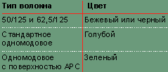 | Таблица 1. Стандартные маркировочные цвета корпусов элементов оптических разъемов по ISO/IEC 11801 : 2002. |