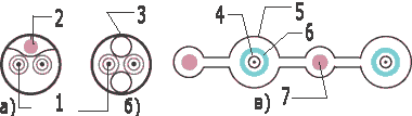 Рисунок 5. Структура кабелей дуплексных оптических коммутационных шнуров систем интерактивного управления и идентификации: а) кабель системы PatchView; б) кабель системы PatchSee; в) кабель системы TracerLight. 1 - Кварцевый световод 2 - Медный проводник 3 - Полимерный световод 4 - Световод 5 - Оболочка из ПВХ 6 - Кевларовые нити 7 - Медный проводник калибром 26AWG |