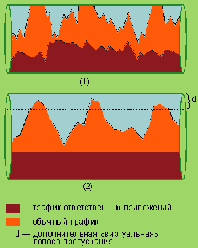 | Рисунок 7. Обычный канал (1) и канал с трафиком, к которому применяется технология «ускорения» Paketeer Xpress и технология управления трафиком Packetshaper, «сглаживающая» форму трафика (2). |