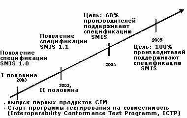 Первая спецификация SMI, SMIS V1.0, станет доступной в конце первого полугодия 2003 г. и наряду с пассивными управляющими интерфейсами будет охватывать и активные функции: например, установку и назначение номеров логических устройств (LUN) и разбиение коммутации Fibre Channel на зоны. Выход расширения для NAS запланирован уже на конец текущего года. Ближайшая цель — добиться, чтобы уже в следующем году 60% новых продуктов соответствовали SMIS, а в 2005 г. все производители должны будут поддерживать спецификацию (см. Рисунок 4).
