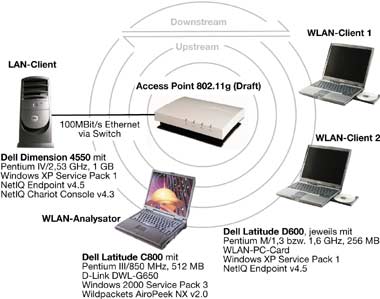 Кроме того, для описываемых измерений со стороны клиента 802.11g мы применяли соответствующие адаптеры того же производителя, что и точки доступа. Исключение удалось сделать лишь в случае решений на базе микросхем Broadcom: ради простоты использовались интегрированные в тестовые ноутбуки Dell Latitude D600 мини-адаптеры Dell Truemobile 1300 для шины PCI стандарта 11g. В соответствии с концепцией Broadcom «один драйвер», при этом использовался тот же драйвер, что и для соответствующих оригинальных карт Belkin и Linksys. Различные перекрестные тесты с разными адаптерами на базе микросхем Broadcom также не выявили существенных отличий в результатах.