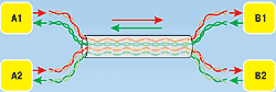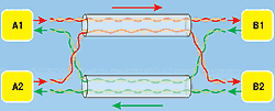 Пусть система связи работает в однокабельном режиме, причем уровни сигналов на выходах передатчиков в точках А и В одинаковы и равны 0 дБ. Если затухание линии на частоте f обозначить через ak, то при переходном затухании NEXT на той же частоте уровни сигнала pс и переходной помехи pp на входе приемника А будут, соответственно, равны ak и NEXT.