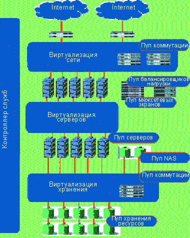 Создание виртуальных пулов, по данным НР, также не зависит от производителя, поскольку НР поддерживает как собственные продукты, так и хранилища ЕМС. Поток данных идет через так называемую «коммунальную фабрику» (Utility Fabric), отказоустойчивую сеть. За администрирование отвечает НР OpenView: новые «самовосстанавливающиеся службы» самостоятельно собирают информацию об ошибках в сети и сравнивают ее с тем, что должно быть. Программное обеспечение контроллеров для виртуализованных пулов готовит шаблоны для быстрой настройки служб управления.