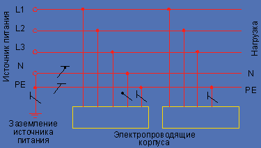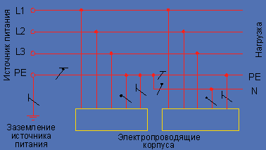 Появление потенциала на корпусе обуславливается падением напряжения в фазном проводнике до точки короткого заземления и падением напряжения в сопротивлении заземлителя №2, в среде (в земле и конструкциях) и в сопротивлении заземлителя №1. Сопротивление цепи короткого замыкания при этом выше сопротивления цепи «фаза—ноль», с учетом параметров которого выбирается защитный автомат, и короткое замыкание, скорее всего, не будет отключено действием максимальной токовой защиты. При этом на корпус выносится потенциал, близкий к фазному напряжению, что создает угрозу для жизни людей. Отключение короткого замыкания произойдет за счет действия тепловой защиты автоматического выключателя, но время отключения КЗ при этом превысит нормируемые значения, составляющие для напряжения U0 = 220 В, — 0,4 с и для U0 = 380 В, — 0,2 с.
