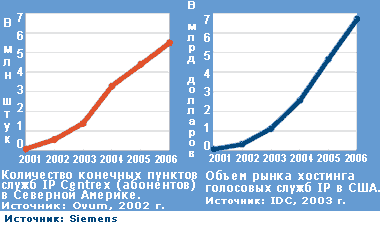 Важную тенденцию в области передачи голоса по IP представляет собой виртуализация телекоммуникаций: функциональность IP УАТС как предоставляемая услуга. Еще раньше операторы перевели телефонный трафик с классической телефонной сети на инфраструктуры Internet. На следующем этапе провайдеры получают возможность предлагать функциональность производительных централизованно установленных IP УАТС в качестве услуг (так называемые службы Centrex). Как утверждается в очередном отчете Frost&Sullivan (также от июня 2003 г.), эти службы (а в США они гораздо популярнее, чем в Европе) наконец-то избавились от своих «детских болезней». Для провайдеров услуг передачи голоса и данных, а также для системных интеграторов, ресселеров и производителей они стали намного привлекательнее (см. Рисунок 5).