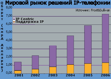 | Рисунок 4. Прогнозы оборота мирового рынка решений VoIP для предприятий на период с 2001 по 2006 гг. |