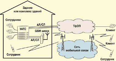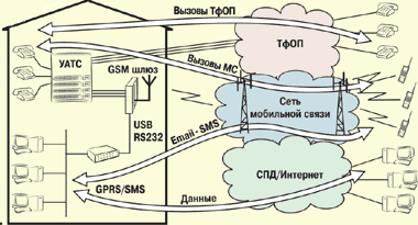 - при невозможности прямого подключения УАТС к ТфОП (за неимением свободных емкостей или кабельных линий) связь можно обеспечить через сеть GSM;
