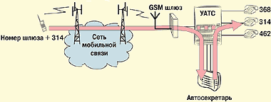 | Рисунок 2. Использование шлюза GSM и автосекретаря для входящей связи. |