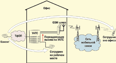 - в случае высоких междугородных тарифов оператора мобильной сети сотрудники с мобильными телефонными аппаратами имеют возможность осуществлять междугородные и международные вызовы через других операторов (через УАТС на соединительные линии альтернативного оператора ТфОП) или по внутрикорпоративным каналам (через УАТС на выделенные каналы — например, мост или шлюз VoIP);