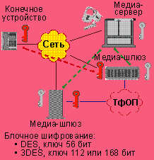 Расшифровка DES (ключ 56 бит) при современном уровне техники занимает приблизительно 3,5 с, в то время как 3DES (ключ 112 бит) в 256 раз надежнее и посредством применения исключительно математических методов может быть взломан за 28,7 млрд лет. Эти цифры свидетельствуют о принципиальной надежности метода DES при условии секретности ключа. Шифрование VPN подходит для любого трафика IP, в том числе и голосового. С его помощью IP-телефония не поддается прослушиванию в транспортной сети, а сигнализация — манипулированию. При использовании VoIP со стандартными виртуальными частными сетями IPSec необходимо принимать во внимание следующие обстоятельства: