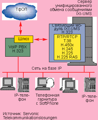 | Рисунок 2. В среде VoIP телефонная станция и система UM взаимодействуют посредством стандарта Н.323 через сеть IP. |