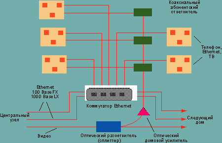 | Электронно-оптический узел здания в конфигурации сети HFC, предлагаемой «Телеком Транспорт». Широковещательный телевизионный сигнал поступает по оптическому волокну на домовой усилитель стоимостью менее 1000 долларов, где сигнал RF усиливается и передается в коаксиальный кабель. При этом сохраняется старый пассивный фрагмент коаксиального кабеля c полосой 300 МГц и цифровым трафиком MPEG2 выше 240 МГц. |