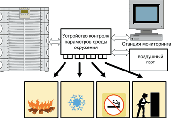 Устройства контроля параметров окружающей среды располагаются отдельно или встраиваются в ИБП. В последнем случае воздушный порт выполняется выносным и подключается посредством кабеля. Внешние датчики и устройства размещаются в необходимых местах и могут быть закреплены на телекоммуникационных шкафах, в серверных стойках и кроссах.