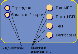 Режим работы ИБП и его состояние (нормальная работа, работа на «байпасе», работа от батарей, батарея разряжена) определяют набор логических параметров вида «Да/Нет». Простейшими средствами контроля параметров являются встроенные в ИБП панели светодиодных индикаторов и внешние сигнализаторы, размещаемые отдельно. Обычно расстояние от ИБП до внешних сигнализаторов не превышает нескольких десятков метров. (В технических спецификациях не приводится ограничений на длину кабелей для подключения сигнализатора к ИБП.) Панели индикаторов совмещены с кнопками управления. Последние не всегда присутствуют на внешних сигнализаторах, вместо них нередко предлагаются только кнопки теста самого сигнализатора и сброса аварийных сигналов. На Рисунке 1 приводится пример состава и внешнего вида панели такого сигнализатора.