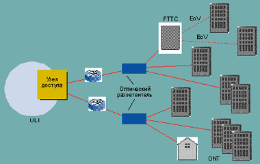 Обычно в таких сетях оптическое волокно прокладывается до оптического распределительного узла на 300—3000 абонентов вблизи группы домов, а конечная разводка осуществляется с помощью коаксиальной сети. Cети HFC требуют меньше вложений, чем FTTC или FTTH, и имеют разные варианты реализации (см. Рисунок 2). При наличии качественных кабельных линий используются кабельные модемы. В оптических сетях PON телевизионный аналоговый сигнал можно «подмешивать» в оптический на третьей длине волны (первые две — это нисходящий и восходящий поток данных), в жилом доме он выделяется и далее разводится по кабельной сети, а данные передаются по витой паре.