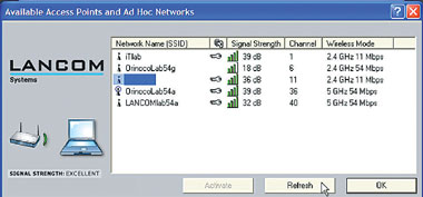 Обнаружить точки доступа в пределах непосредственной досягаемости можно с помощью поставляемых вместе с адаптерами WLAN клиентских утилит (см. Рисунок 1). Конечно, в первую очередь они предназначены для обеспечения готовности адаптера WLAN к работе, однако новые комбинированные беспроводные карты поддерживают несколько стандартов, а потому пользователь получает простое вспомогательное встроенное средство, благодаря которому он может определить активные точки доступа и распознать потенциальное излучение в близко к друг другу расположенных каналах в диапазоне 2,4 ГГц стандартов 802.11b и g. Карты стандартов a/b/g — Lancom MC-54ag, Linksys WPC54AG, Netgear WAG511 и Proxim Orinoko 11a/b/g Combocard на базе набора микросхем Atheros — посредством поставляемых с ними утилит снабжают информацией о применяемых режимах WLAN (стандарт 802.11), об используемых частотных каналах, а также о статусе шифрования WEP и интенсивности сигнала.