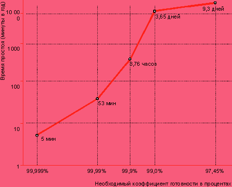 Чем короче допустимое время простоя, тем выше необходимый коэффициент готовности оборудования ИТ.